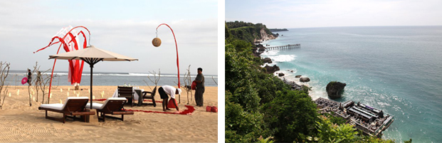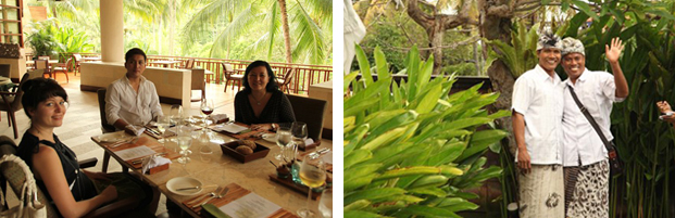 Последний осмотр на сегодня –Amanusa. Отель знаменитой эксклюзивной цепочки Aman Resorts. Его весьма выгодно отличает от других отелей статус бутик-отеля самого высокого класса с небольшим количеством вилл, с персоналом, который работает в отеле по 20 лет, с гостями, точнее членами семьи Aman Resorts ( и это правда – многие поклонники этой цепочки останавливаются в Aman по всему миру). Виллы с подчеркнуто лаконичным фирменным стилем, чудесные рестораны и отличный винный погреб (который был тут же оценен нашим специалистом ). Но главное богатство отеля – безусловно, его персонал. Отель имеет особенность – пляж находиться в 5 минутах езды на гольф-каре от отеля. Пройдя по тропинке, видим приготовление к романтическому ужину на пляже (все девушки всех возрастов грустно вздохнули и каждая, вероятно, подумала – «жаль, что не для меня»). Впереди – дорога в Убуд.