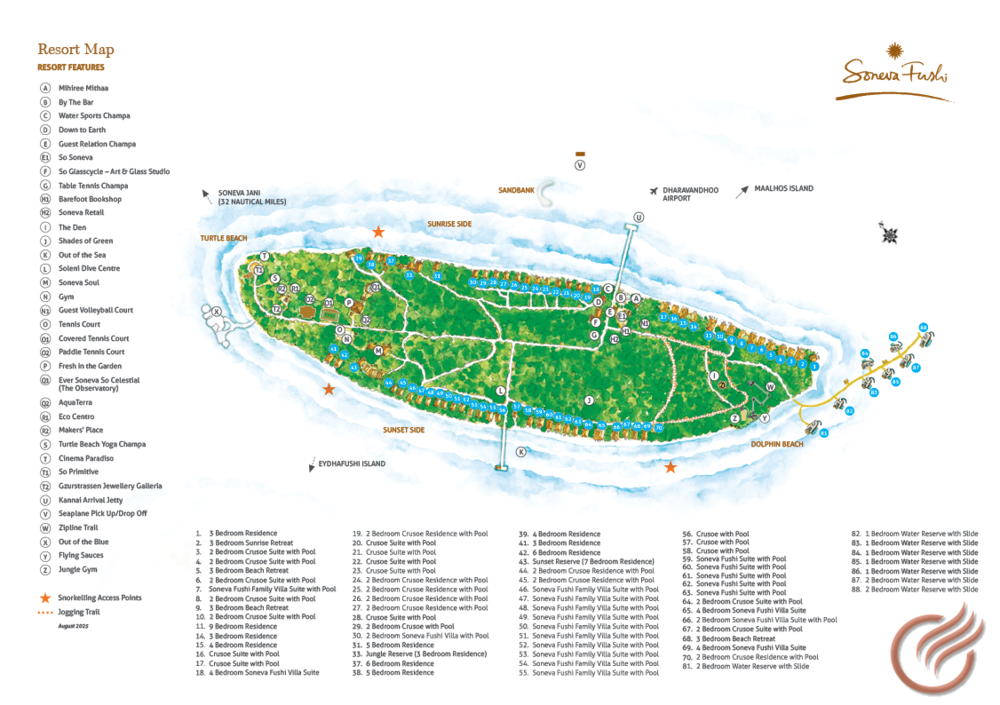 1 Private Reserve (5540 кв.м) — самая большая резиденция в отеле, представляет из себя комплекс вилл, расположенных вокруг огромного бассейна с водной горкой, на восточном берегу острова. Несколько гостиных и обеденных зон, ТВ-лаунж, 9 спален (каждая - со своей ванной комнатой), СПА с парной и сауной, тренажерный зал. План 1 этажа. План 2 этажа. План 3 этажа.