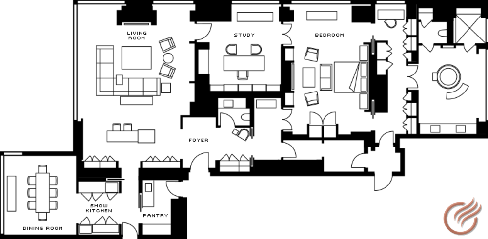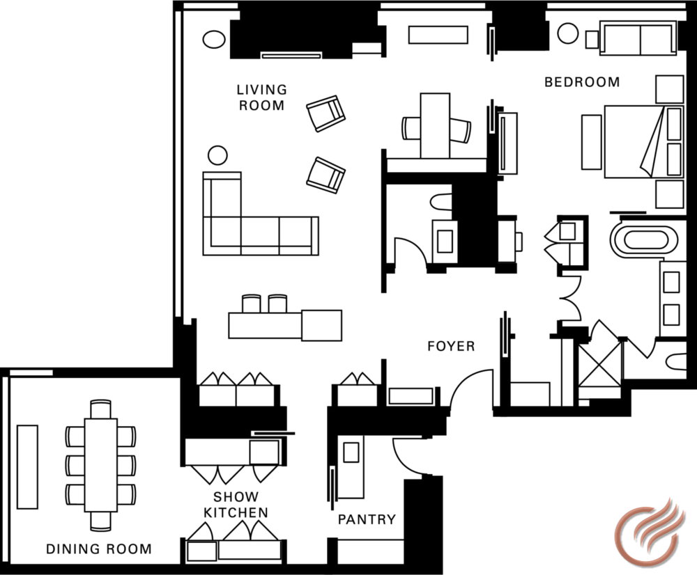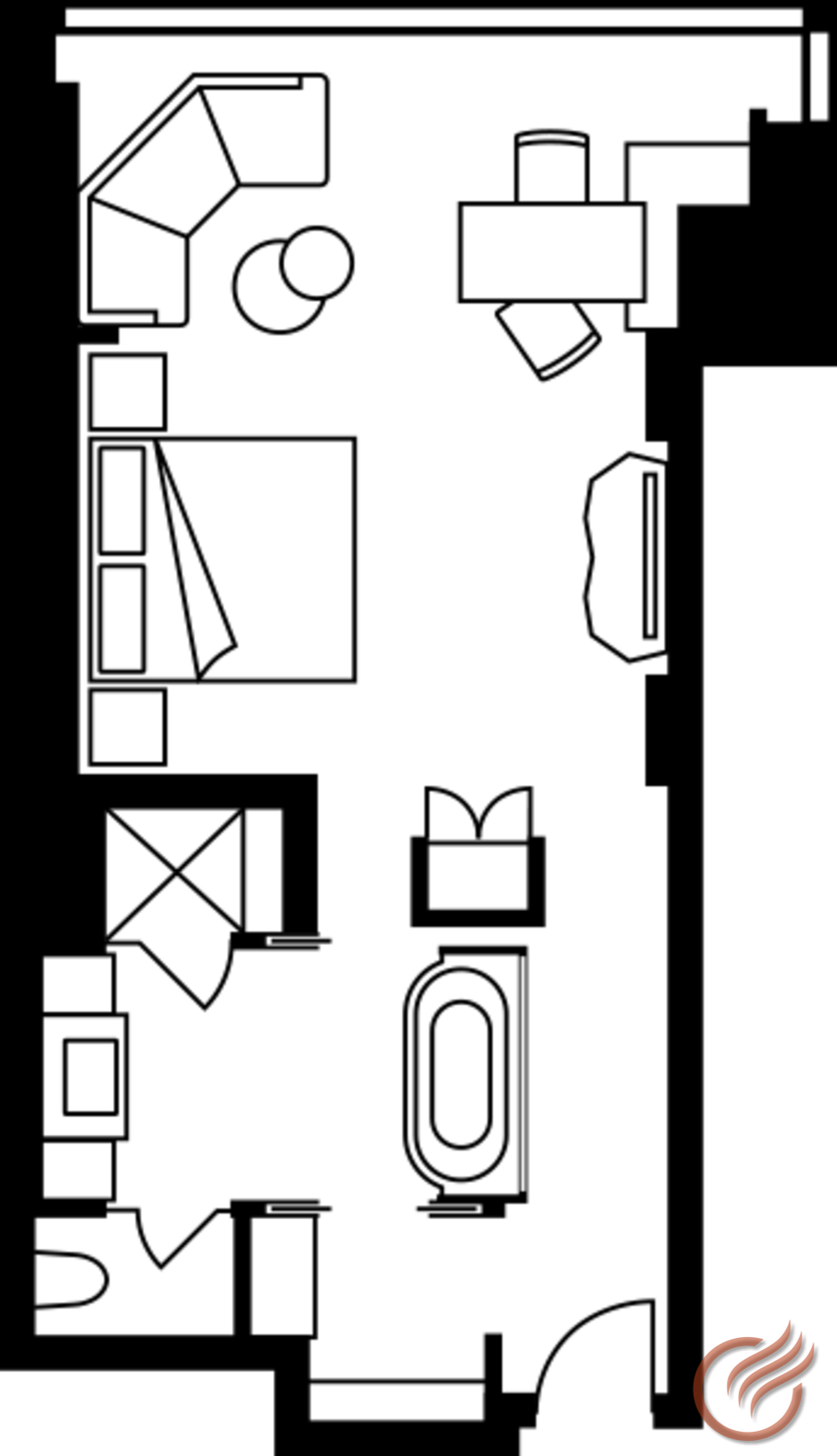 Royal Suite (241 м²) — премиальный сьют на 18 этаже, самый просторный в отеле, с великолепными видами и просторной жилой зоной — идеальный выбор для гостей, ищущих максимальный комфорт и приватность. План номера
