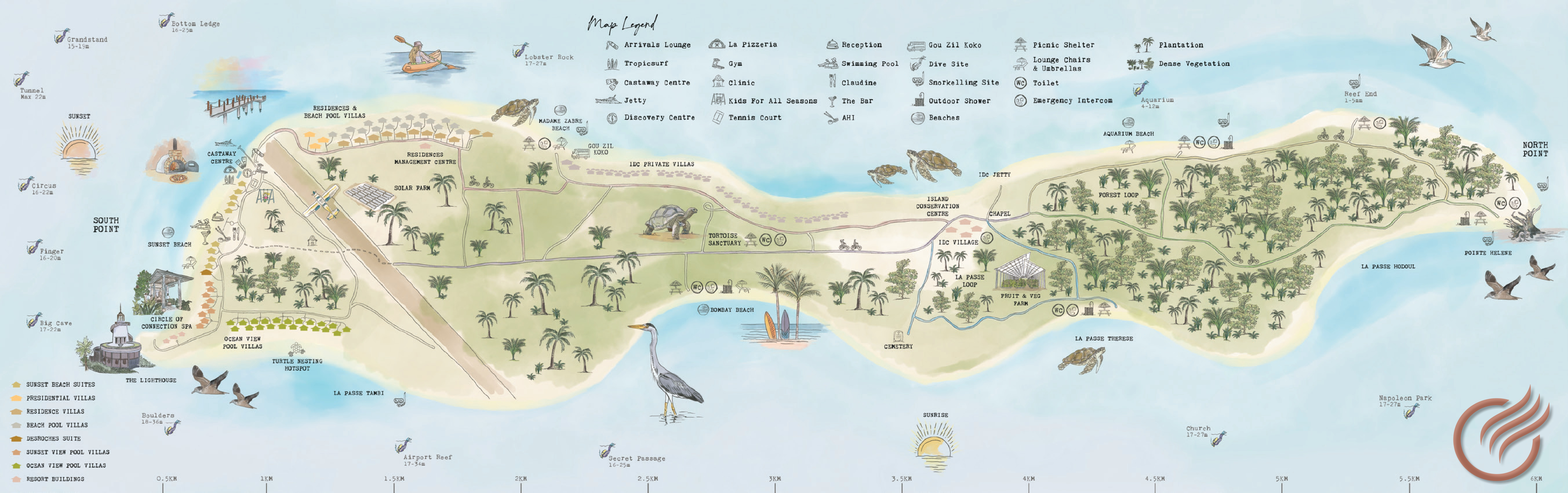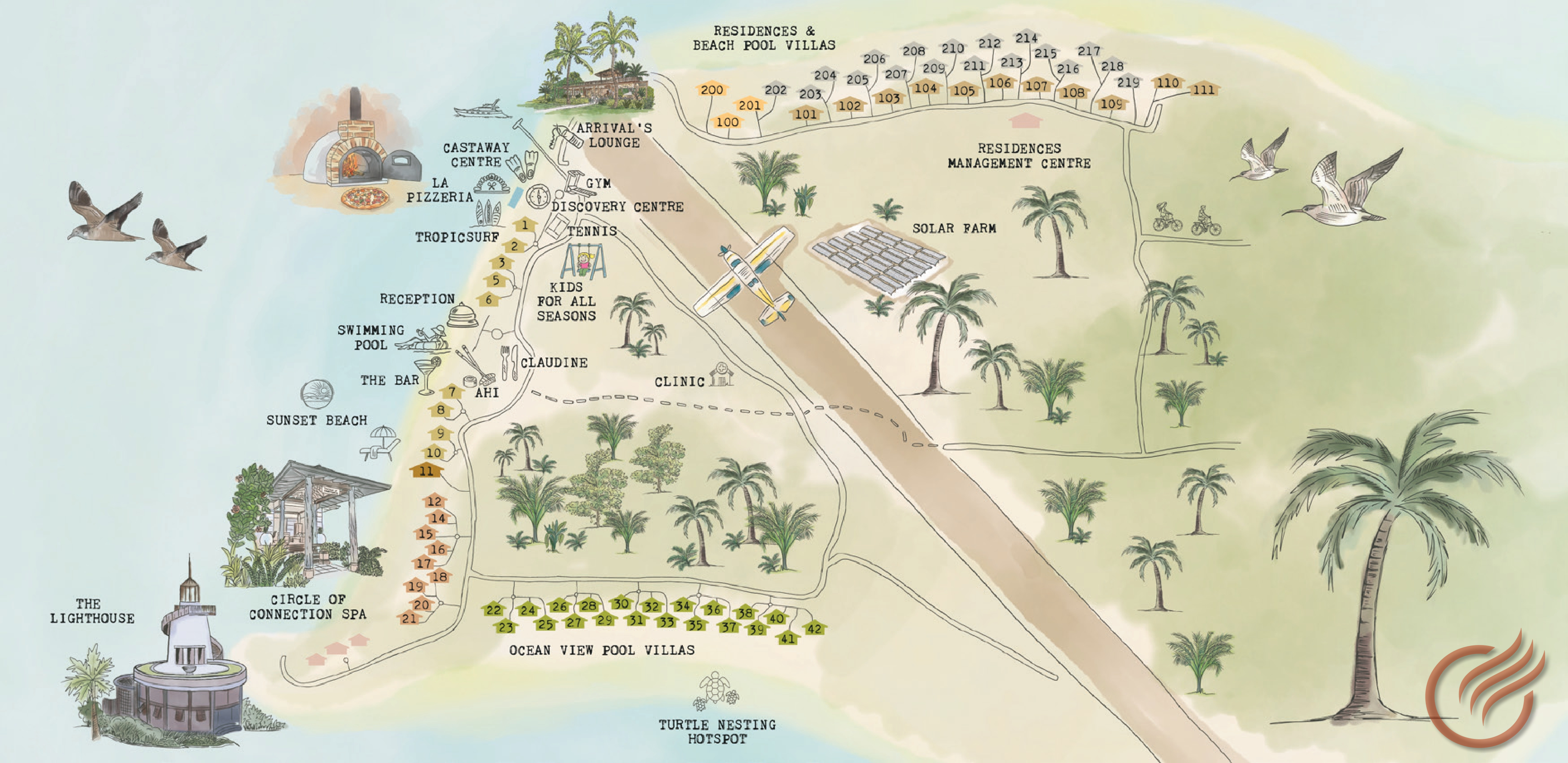 9 Sunset Beach Suite (267 кв.м) – виллы, расположенные на пляже Sunset Beach в западной части острова с видом на океан и прямым выходом к пляжу. Состоят из гостиной, спальни, кабинета с софой, ванной комнаты с ванной и душевой кабиной. Имеется дополнительная туалетная комната. Частный сад с газебо и собственным бассейном. План виллы