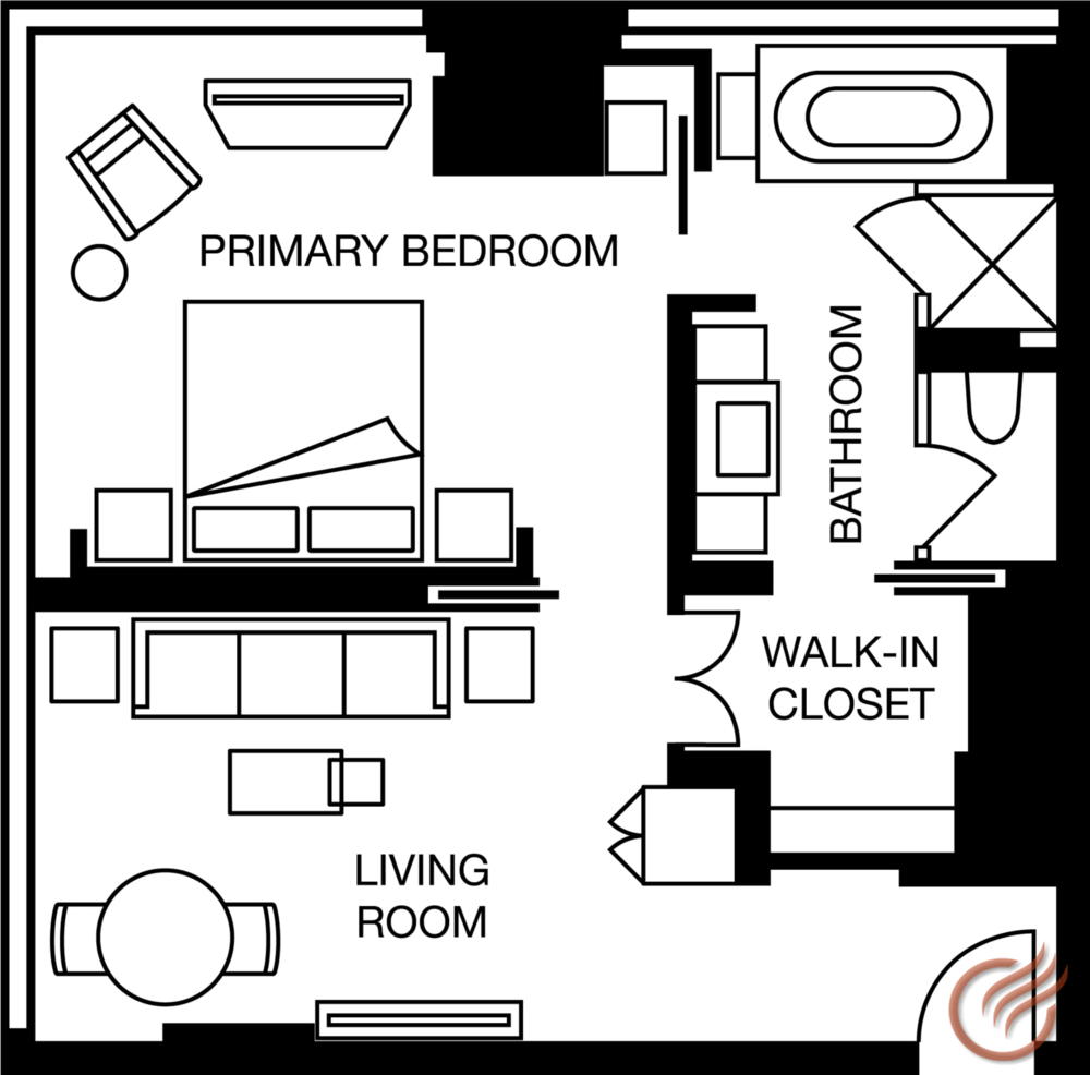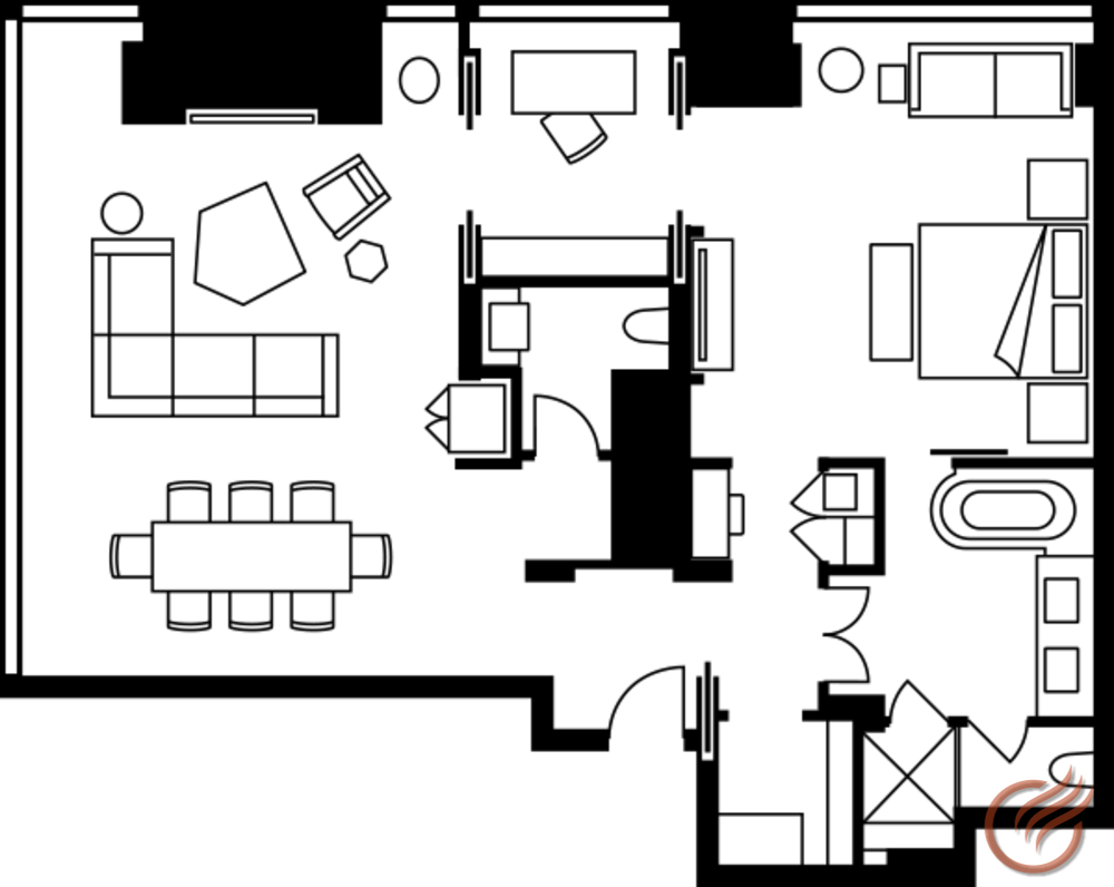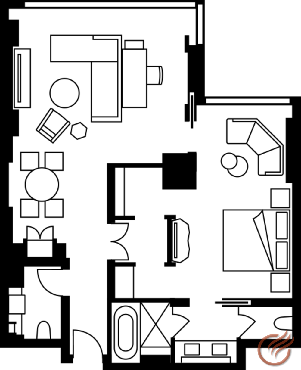 Royal Suite (241 м²) — премиальный сьют на 18 этаже, самый просторный в отеле, с великолепными видами и просторной жилой зоной — идеальный выбор для гостей, ищущих максимальный комфорт и приватность. План номера