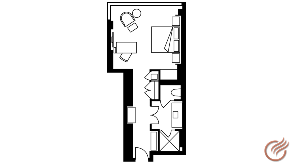 City-View Room (52–55 м²) — номер с окнами от пола до потолка, предлагает вид на город, оснащён гибкими вариантами спальных мест: king или twin + диван-кровать/дополнительная кровать. План номера