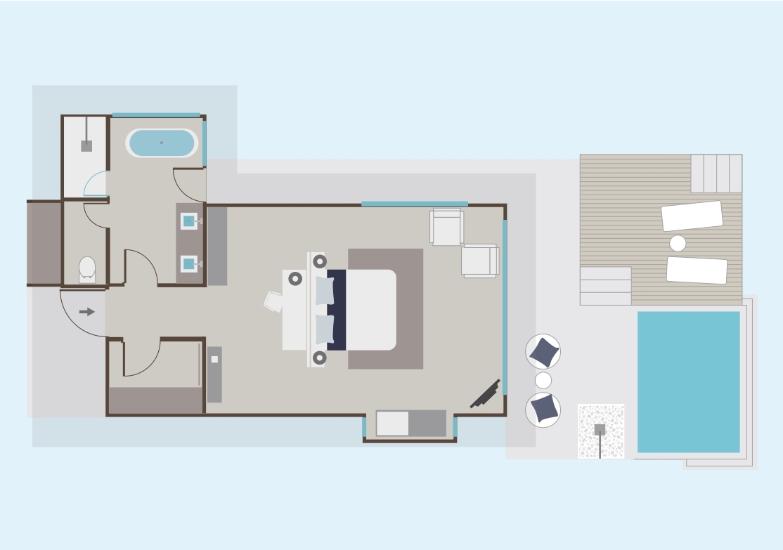 5 Deluxe Beach Suite with Pool (190 кв.м) – виллы находятся на берегу, с выходом на пляж. Каждая вилла состоит из гостиной с обеденной зоной и гостевым санузлом, отдельной спальни, ванной комнаты и просторной террасы с шезлонгами и приватным бассейном. План виллы