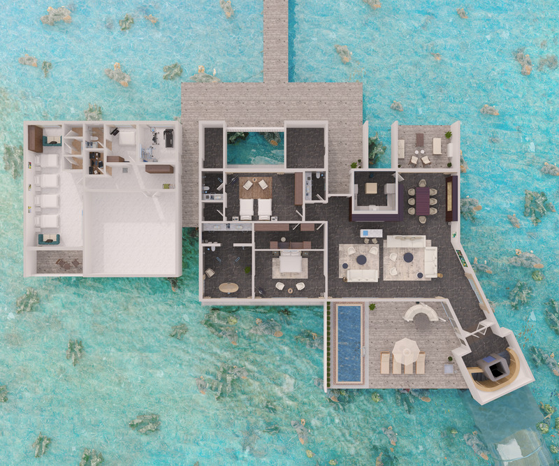The Muraka - резиденция расположена в некотором отдалении от основного острова. Над водой находится просторная гостиная с баром и столовой зоной, две спальни (каждая - со своей ванной комнатой), небольшой тренажерный зал и терраса-палуба с панорамным бассейном и спуском в воду. А под водой - главная спальня с изогнутым куполом и обзором 180 градусов, в ванной и гардеробной - французские окна, специальный смотровой зал с обзором из туннеля. К услугам гостей - собственный дворецкий и шеф-повар, по запросу - свой СПА-терапевт и фитнес-тренер. Гостям предоставляется в пользование JetSki, для передвижения между островами, принадлежащими отелю. Есть комната для персонала. План 1-го этажа. План подводного этажа.