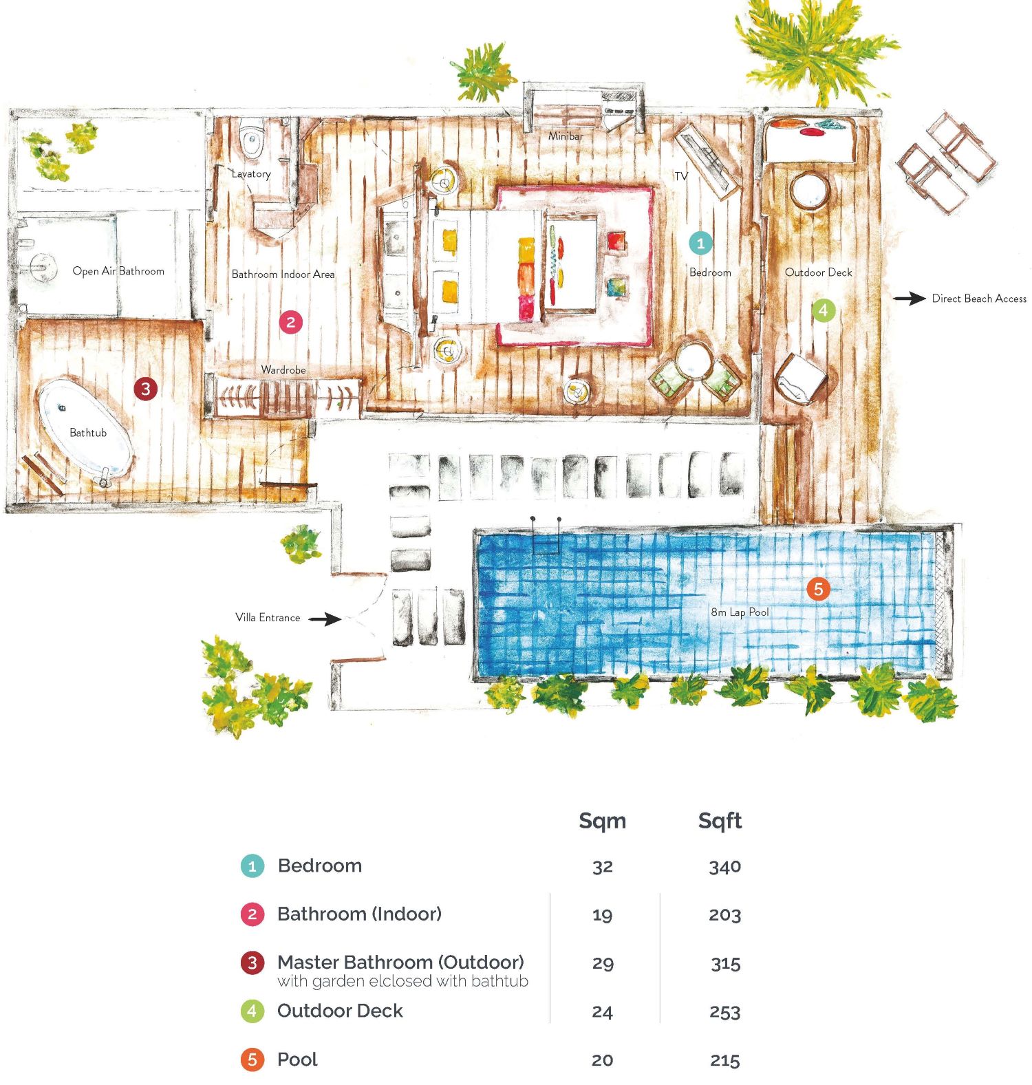 17 Earth Villa with Pool (185 кв.м) – виллы, аналогичные предыдущим, с приватным бассейном длиной 8м. и видом на закат. План виллы