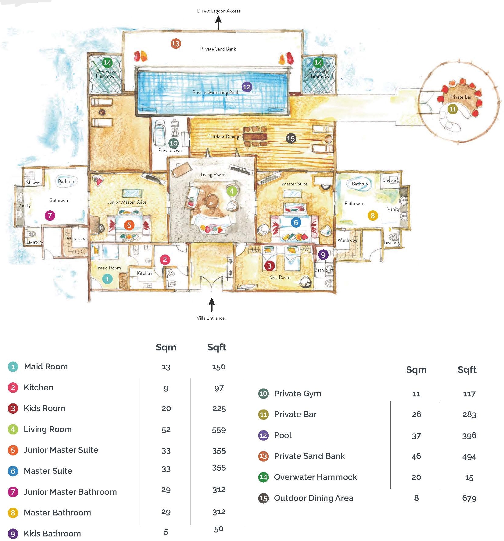 10 Earth Pool Pavilion (285 кв.м) – виллы расположены на пляже. В каждой вилле – основная спальня, ванная комната, детская спальня и терраса с приватным бассейном. План виллы